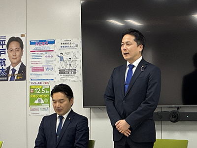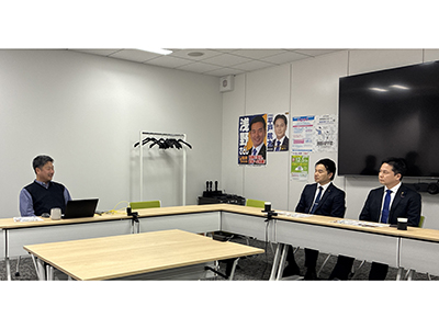 2025年12月22日(月)に、浅野さとし衆議院議員、平戸航太参議院議員が東京事務所にご来訪され、今年1年を振り返り、第27回参議院議員選挙対応における全電線加盟単組へのお礼や国民民主党の政策実現に関する説明、全電線の政策課題について意見交換を行いました。